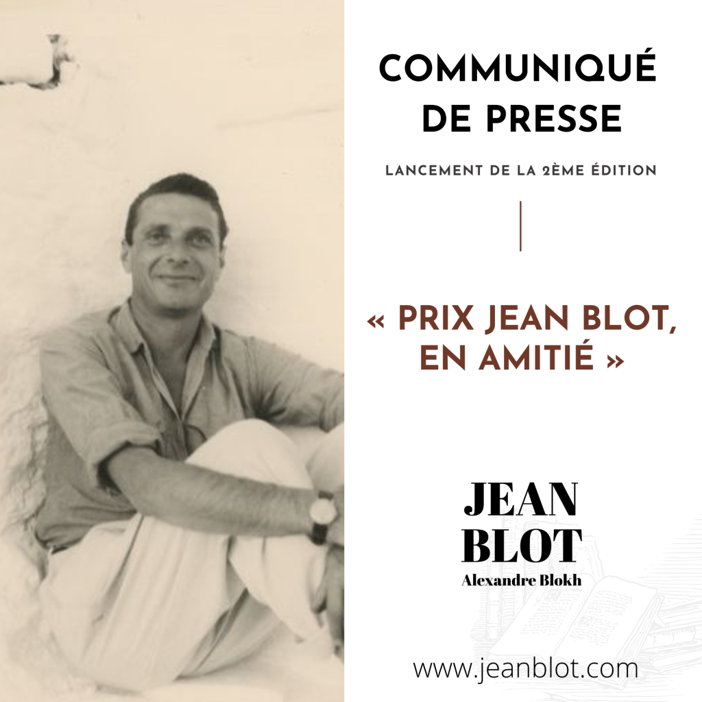 Le « Prix Jean Blot, en amitié » couronne chaque année impaire une œuvre (essai, biographie, roman, hommage…) célébrant « les amitiés littéraires et artistiques » et publiée durant les deux années écoulées par un auteur autour de l’œuvre ou la personnalité d’un créateur. Et ce dans l’esprit du fondateur de ce nouveau prix littéraire, Jean Blot, qui accordait une part très importante de son temps à son amitié avec nombre de grands écrivains et artistes internationaux.