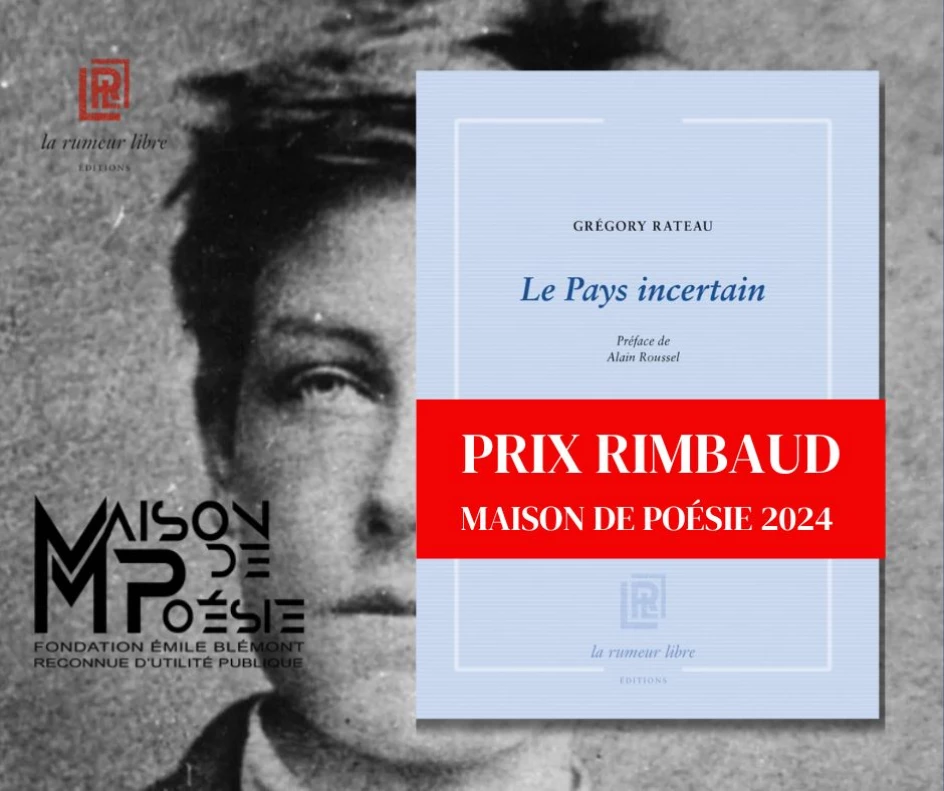 Le Prix Rimbaud 2024 est décerné à Grégory Rateau pour Le Pays incertain à la Rumeur libre éditions. Dédié à la jeune création poétique, tous les ans, il était décerné à un jeune poète de 18 à 25 ans, mais a désormais évolué, saluant l’aspect novateur d’une œuvre. « Une gerbe incandescente que l’on attendait depuis Rimbaud, Vaché, Desnos, Jouffroy et Borer »,  Sylvestre Clancier, président de la Maison de poésie.