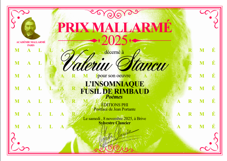 Le Prix Mallarmé 2025 est attribué à Valeriu Stancu (né le 27 août 1950 à Iași).